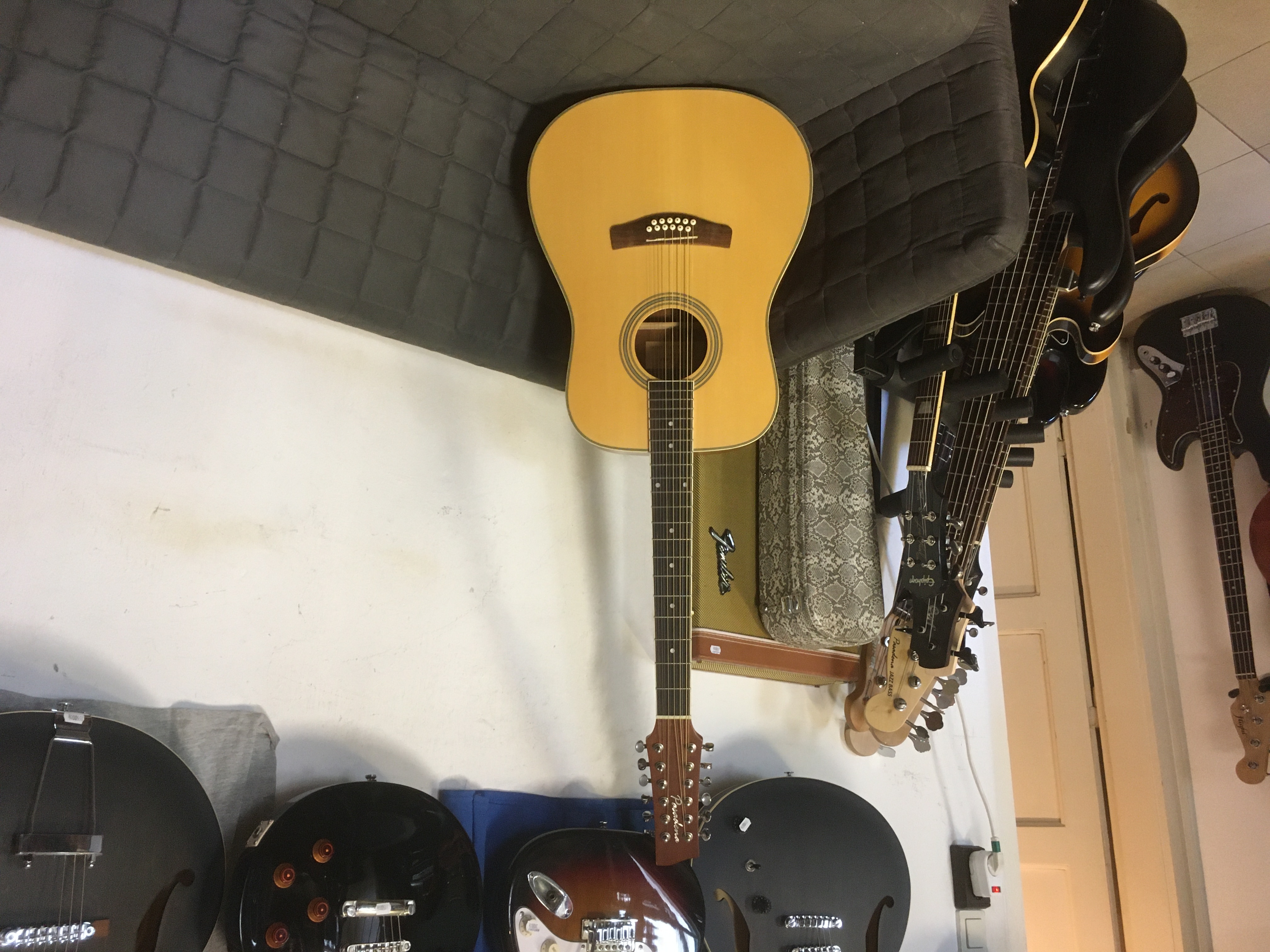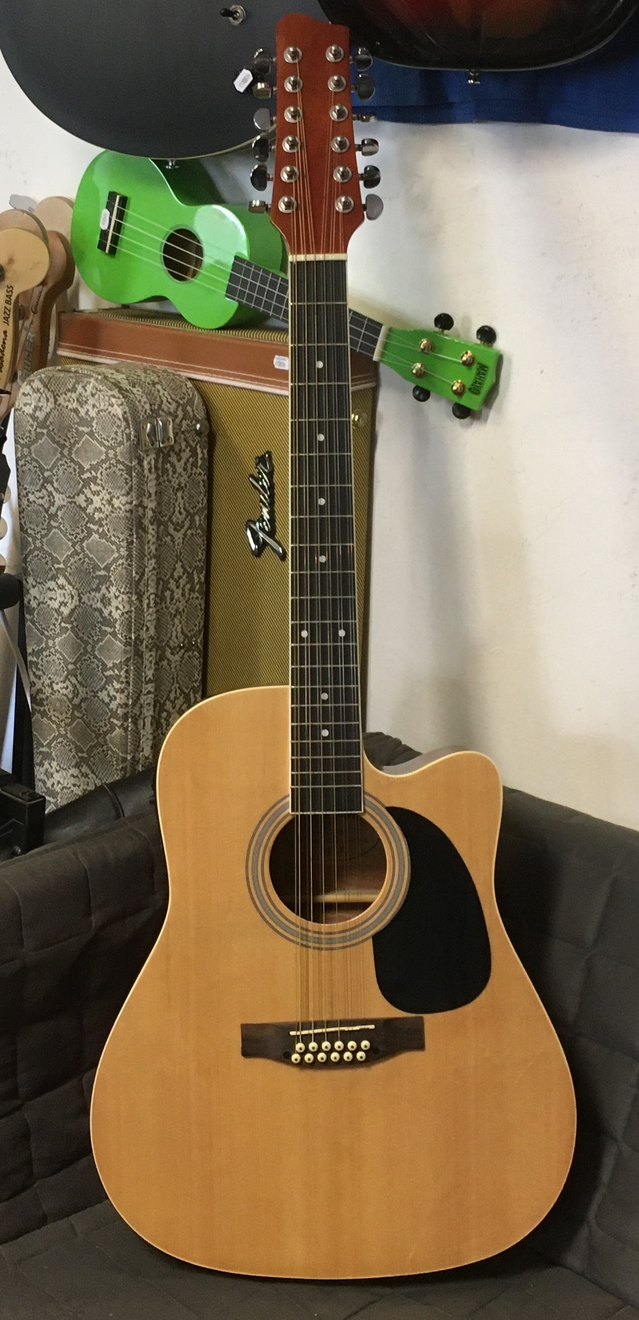 Pasadene 12 húros dreadnought elektro-akusztikus gitár. Hangológépes Fishman elektronikával, zártkenésű kulcsokkal, hihetetlen alacsony húrnyomással,újszerű állapotban. Használt.