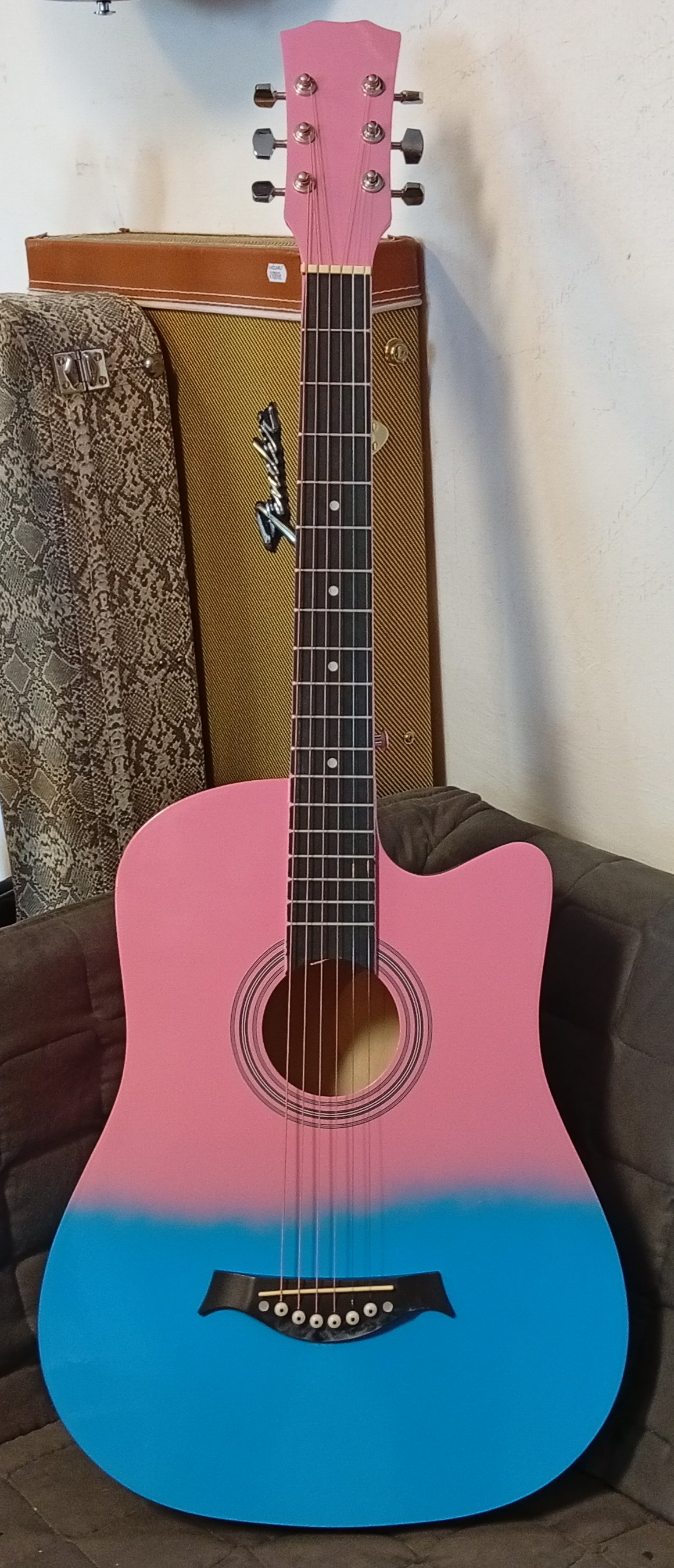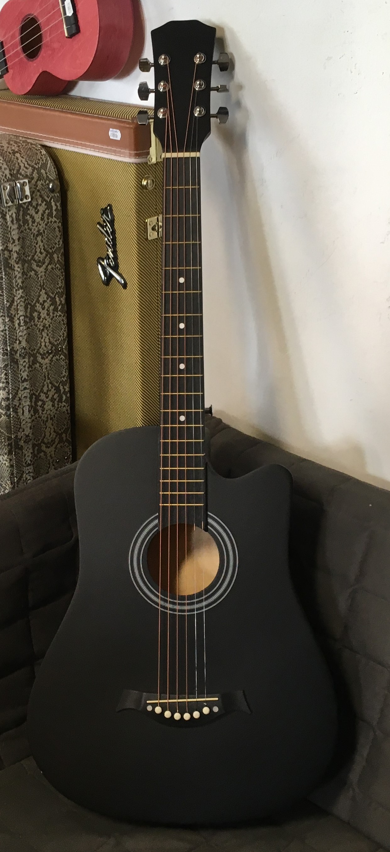 Név nélküli acélhúros akusztikus gitár. Cutaway testforma. Zengő húrhossz: 63 cm. Mini dreadnought test-nagyság.