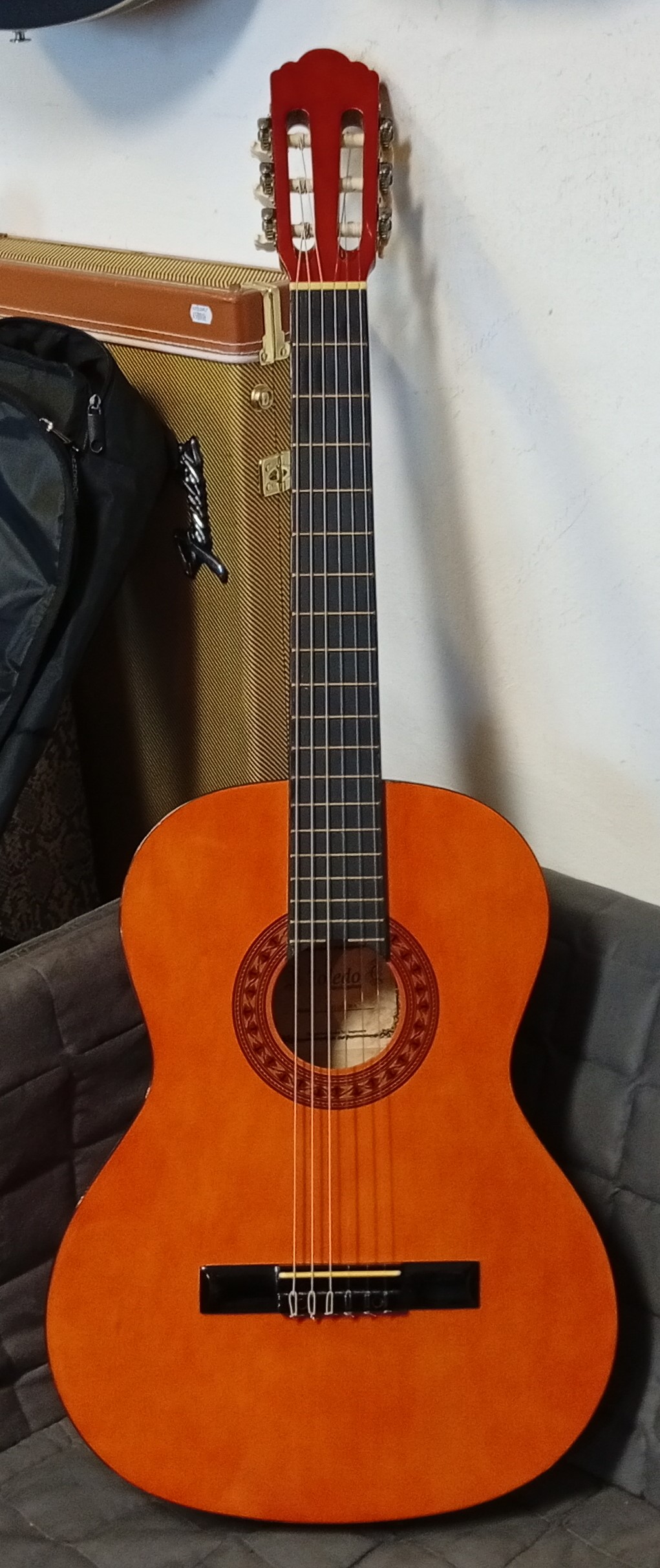 | Valencia klasszikus gitár,- minőségi-cserés kulcsokkal, koppantó-lappal, Fishman-elektronikával.Átfűzős húrláb, minimális húrnyomás.Használt.