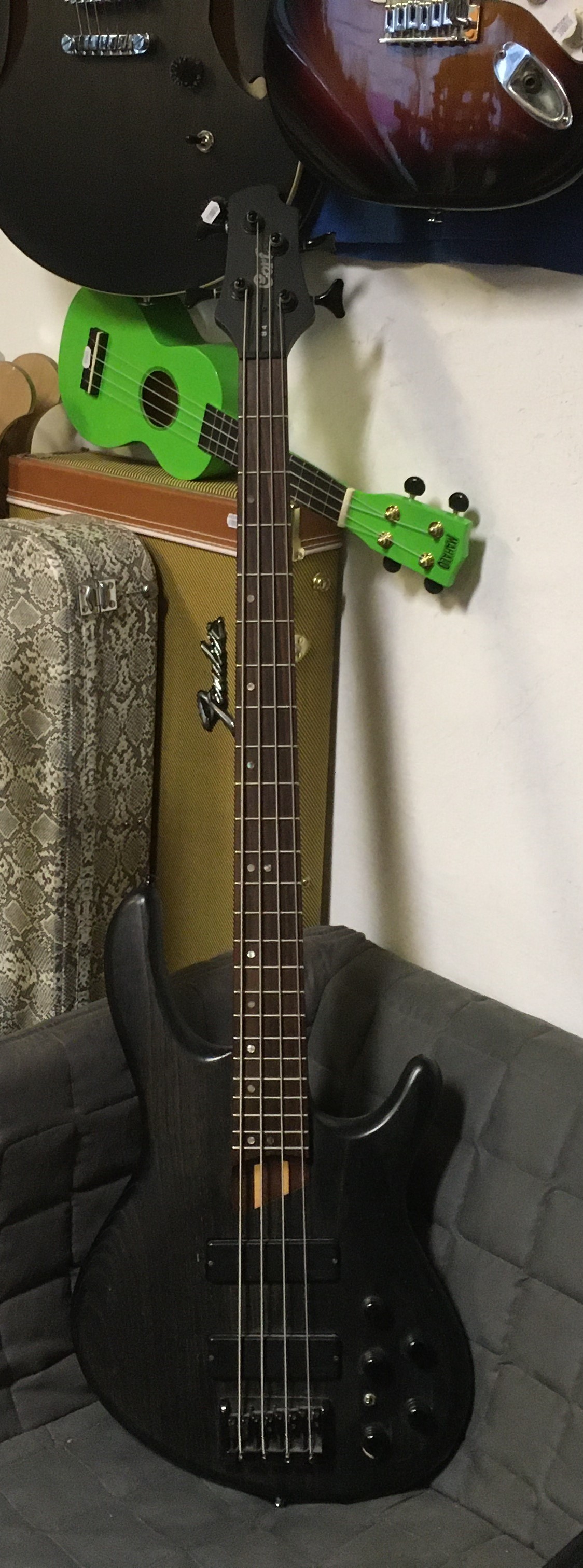 Cort B 4 aktív basszusgitár. A potméterek felől a fedlap be van repedve/nyomódva, de az elektronika tökéletesen működik. A hiba igény szerint(a hangszer tehát így is működik) javítható. A hangszer ára az imertetett hiba alapján erősen kedvezményes. Használt.